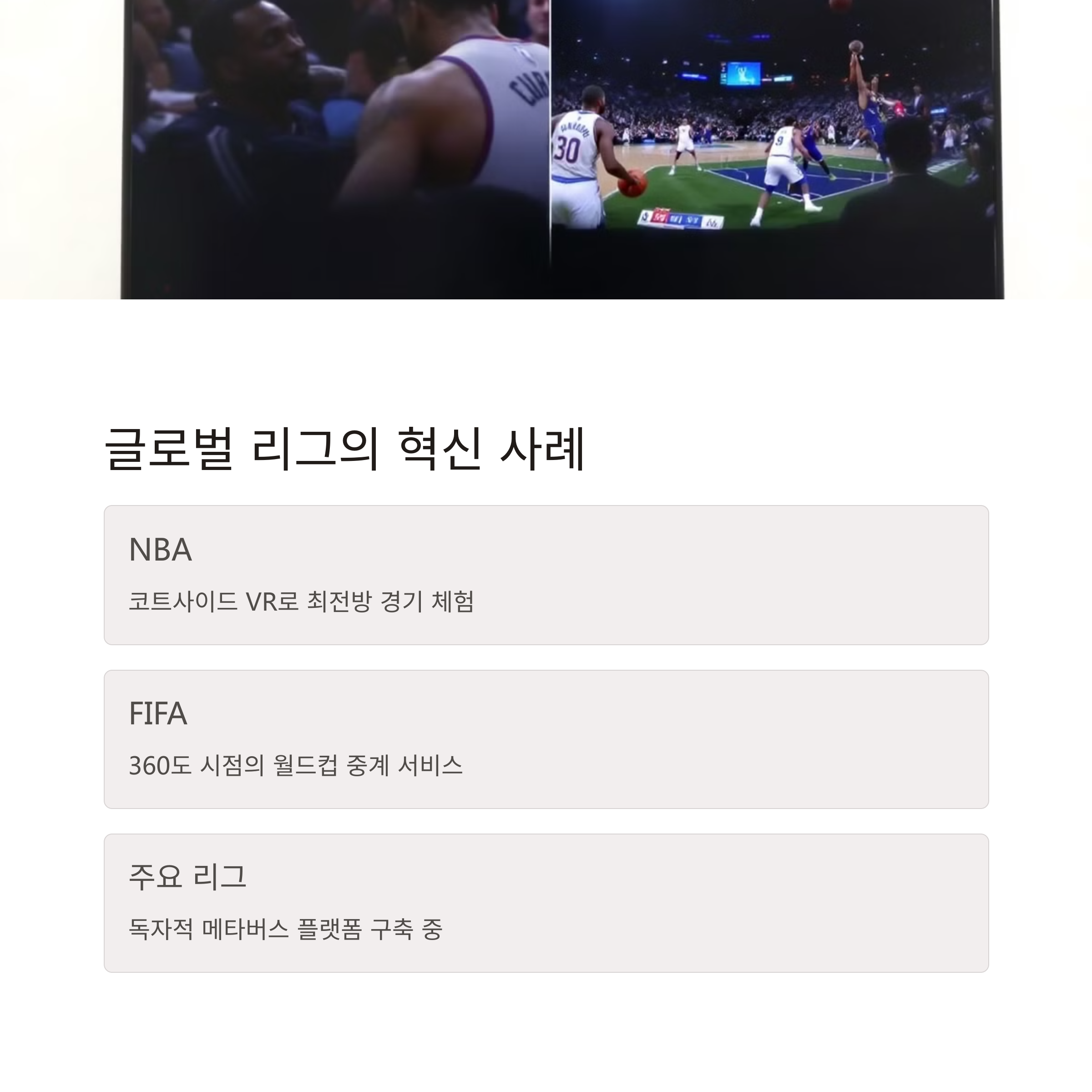 | 메타버스 마케팅 | VR 스포츠 중계 | 팬 경험 혁신 |