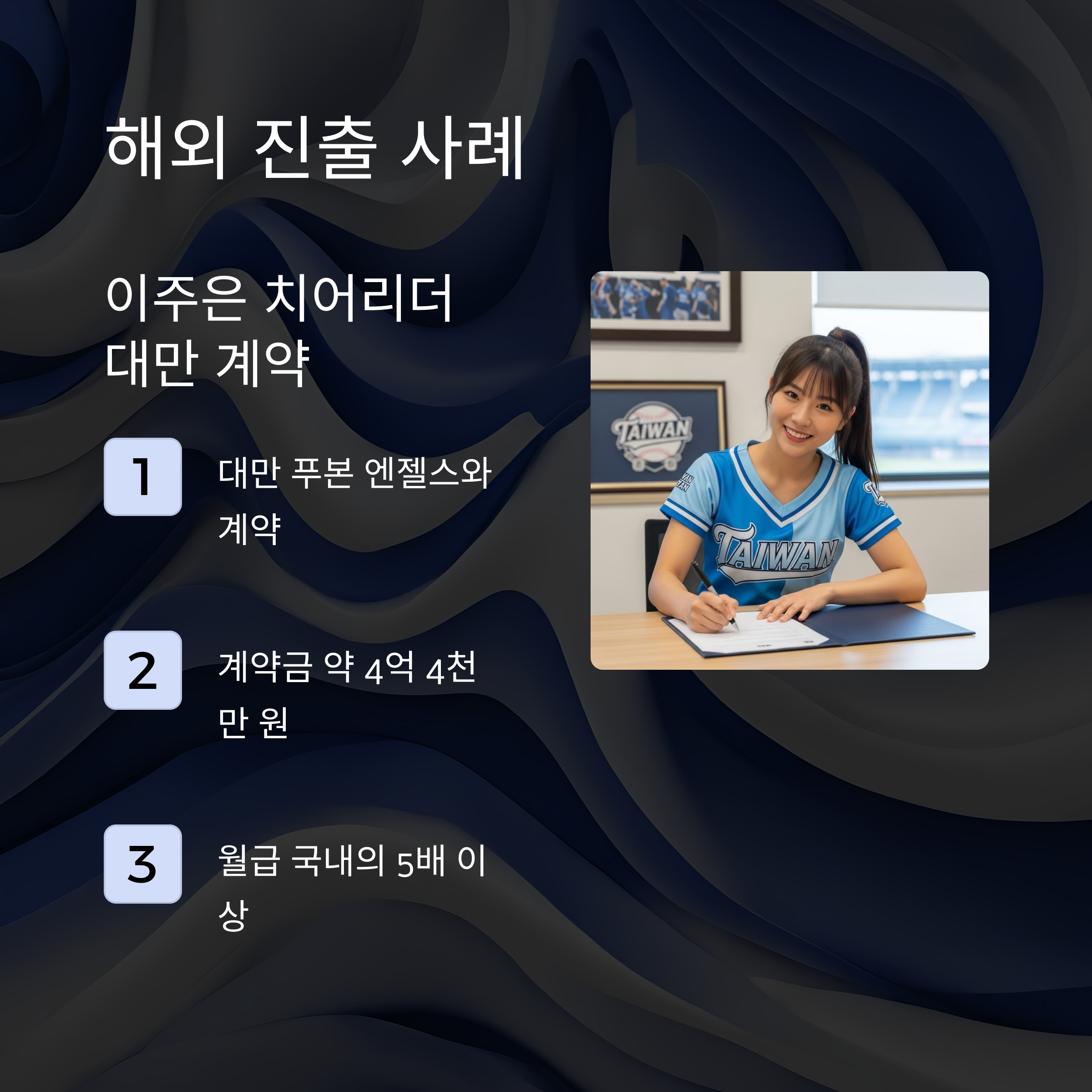 최근에는 국내뿐 아니라 해외 무대로 진출하는 치어리더도 있다. 대표적으로 대만 프로야구 푸본 엔젤스와 계약한 이주은 치어리더의 사례가 주목받는다. 그녀는 계약금만 약 4억 4,000만 원에 달하는 조건으로 계약했으며, 월급 역시 국내 수준의 5배 이상이라는 분석이 있다. 이는 국내 치어리더 수입 수준과 비교했을 때 엄청난 격차로, 해외 진출의 가능성과 가치를 보여주는 사례다.