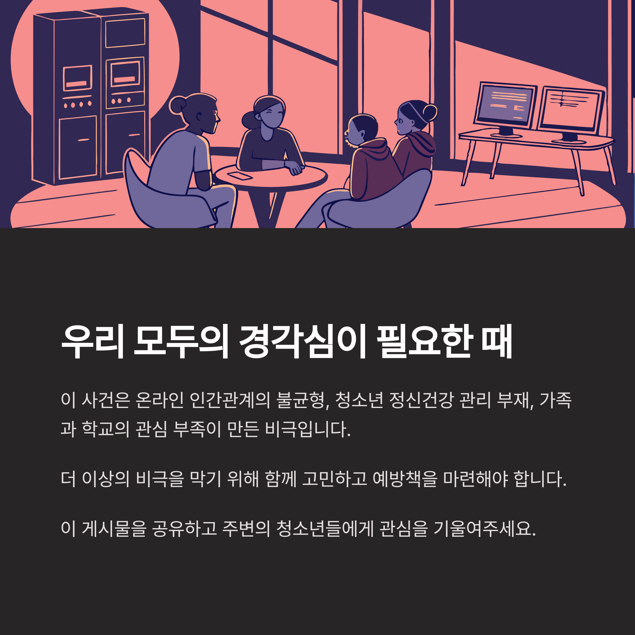 이 사건은 단순한 청소년 범죄를 넘어 현대 사회가 안고 있는 여러 문제를 드러낸 상징적인 사건입니다. 사천 크리스마스 가해자의 행동은 온라인 인간관계의 불균형, 청소년 정신 건강 관리의 부재, 그리고 가족과 학교의 관심 부족이 만든 비극이라 할 수 있습니다. 더 이상 이러한 사건이 반복되지 않기 위해서는 사천 크리스마스 가해자 사건을 단순히 남의 일로 치부해서는 안 됩니다. 우리 사회 모두가 함께 고민하고 예방책을 마련해야 할 때입니다.