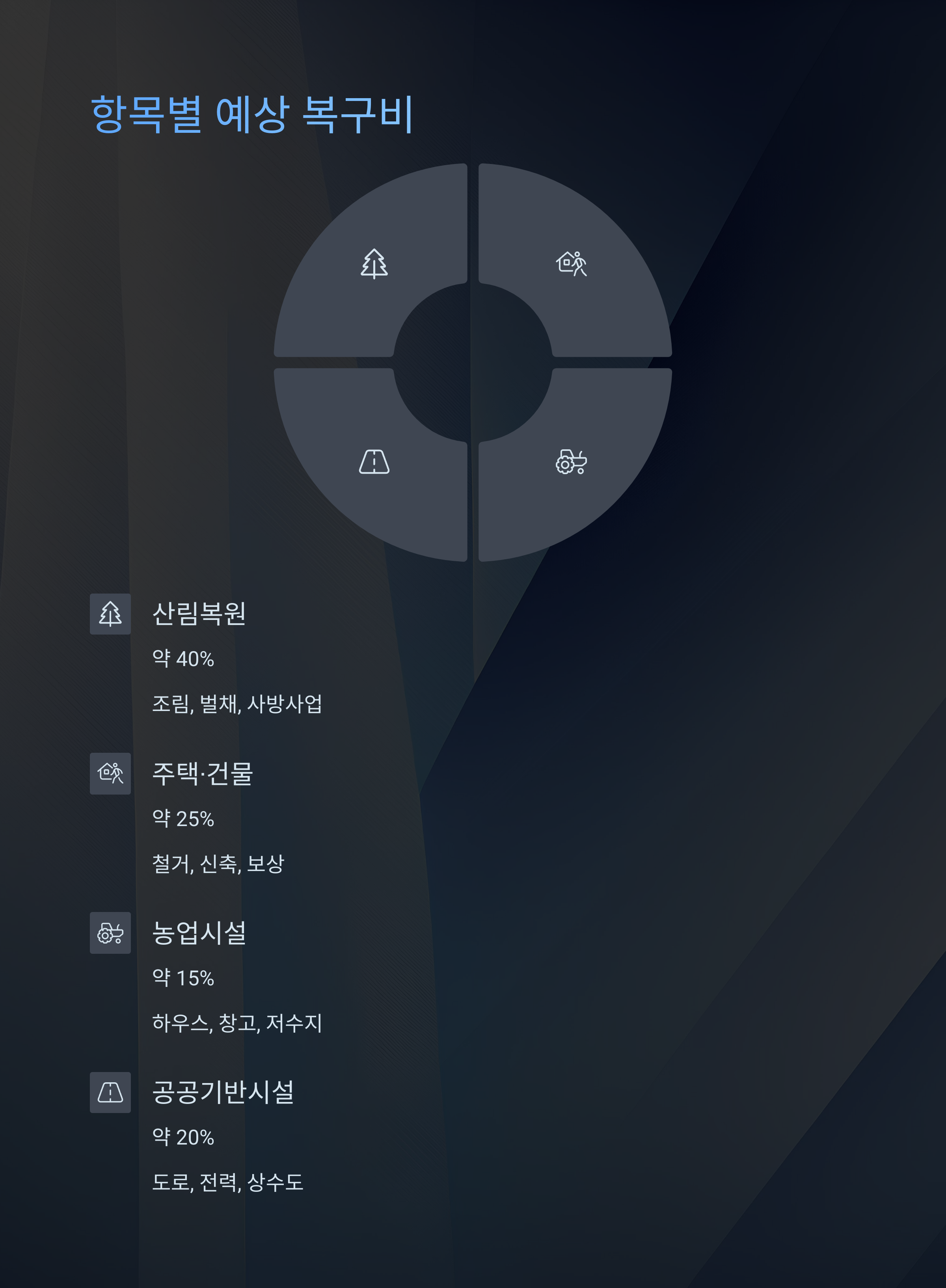 복구 예산은 단순한 재건이 아니라 지역 경제 회복과 주민 생계 지원까지 포함됩니다.