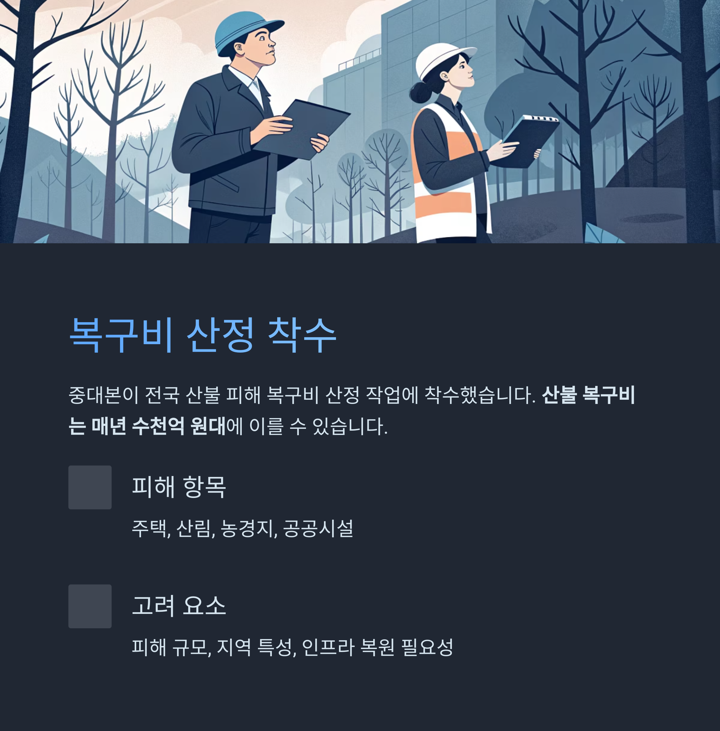 2025년 봄철 전국에서 발생한 산불 피해가 커지며 중앙재난안전대책본부(중대본)는 복구비 산정 작업에 착수했습니다.