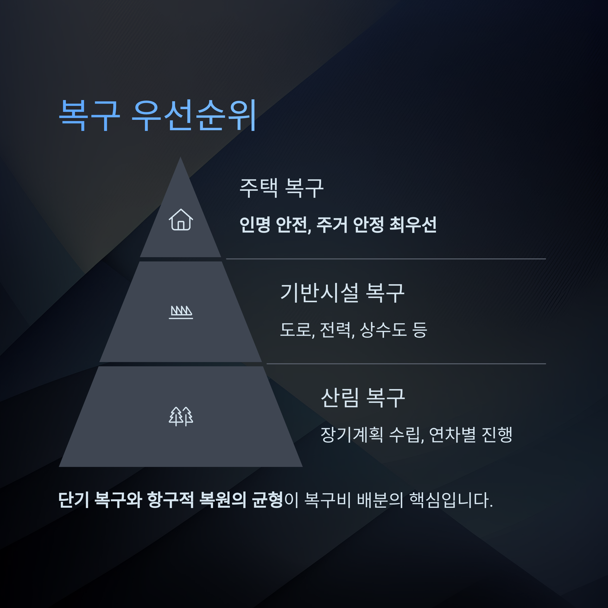 단기 복구와 항구적 복원의 균형이 복구비 배분의 핵심 기준입니다.